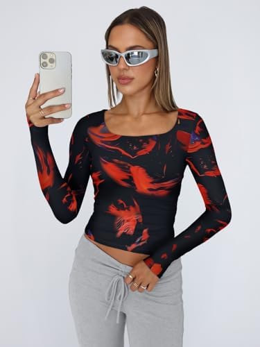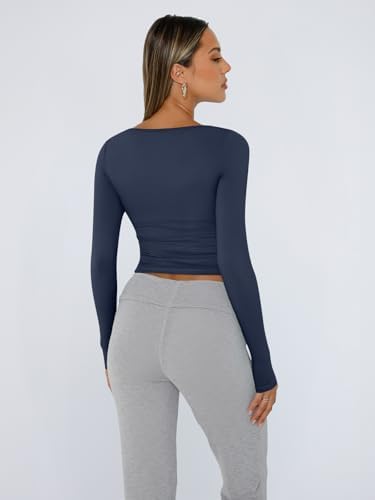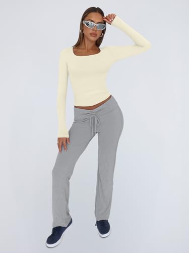 Trendy Queen Womens Long Sleeve Shirts Crop Tops Fall Fashion 2025 Square Neck Going Out Basics Tees Y2k Clothes